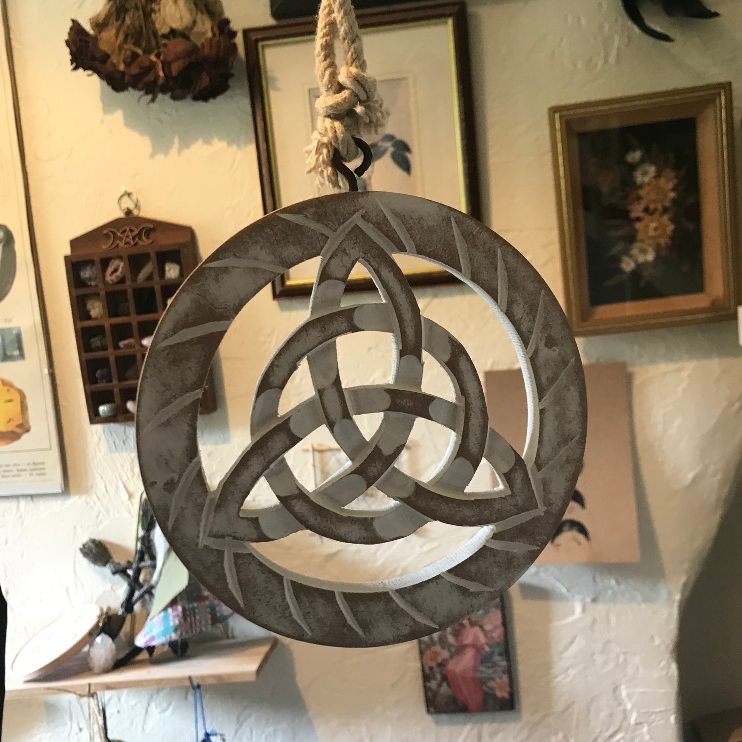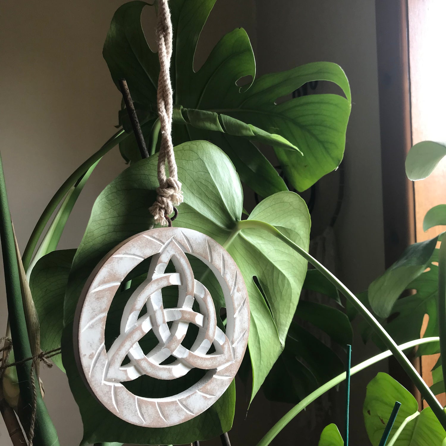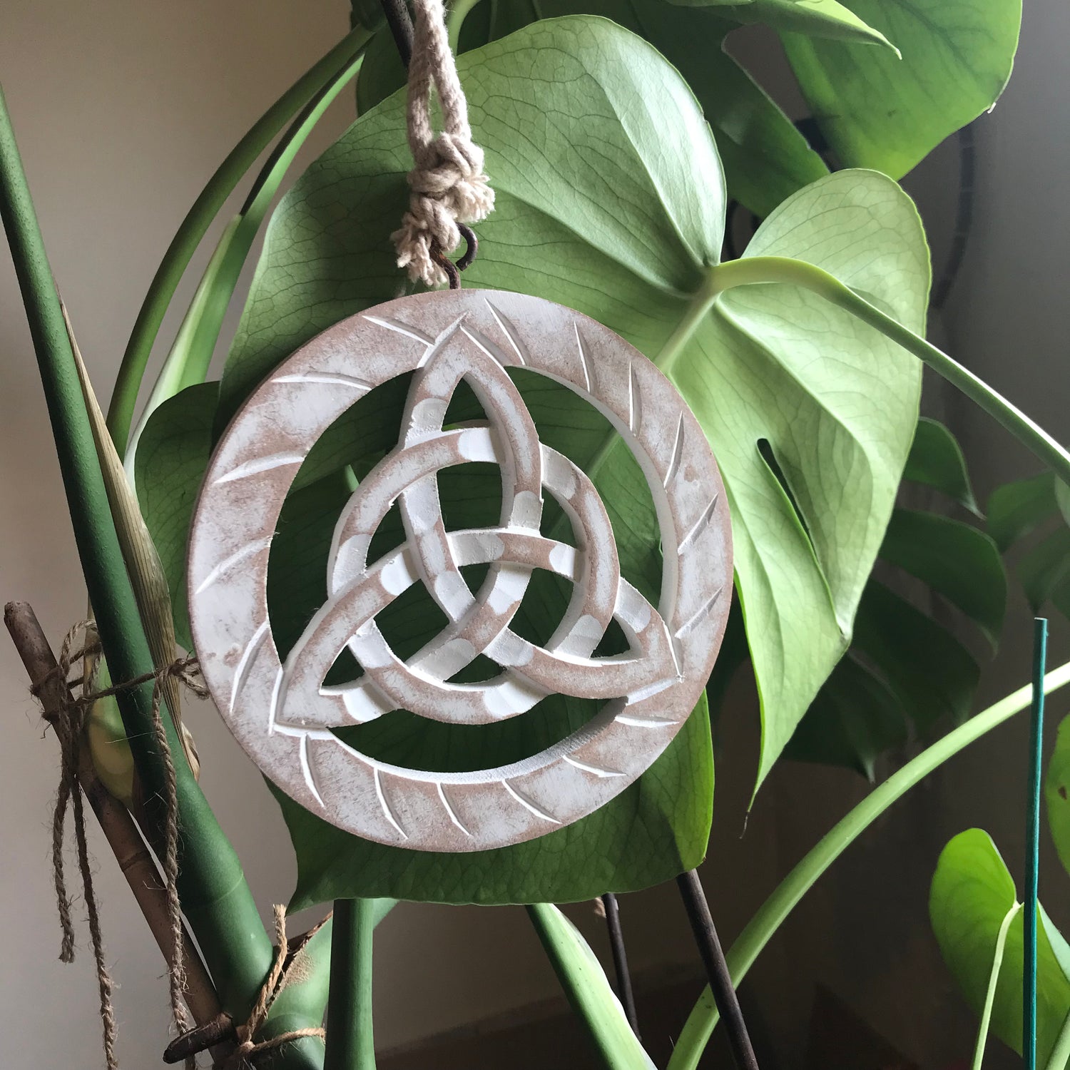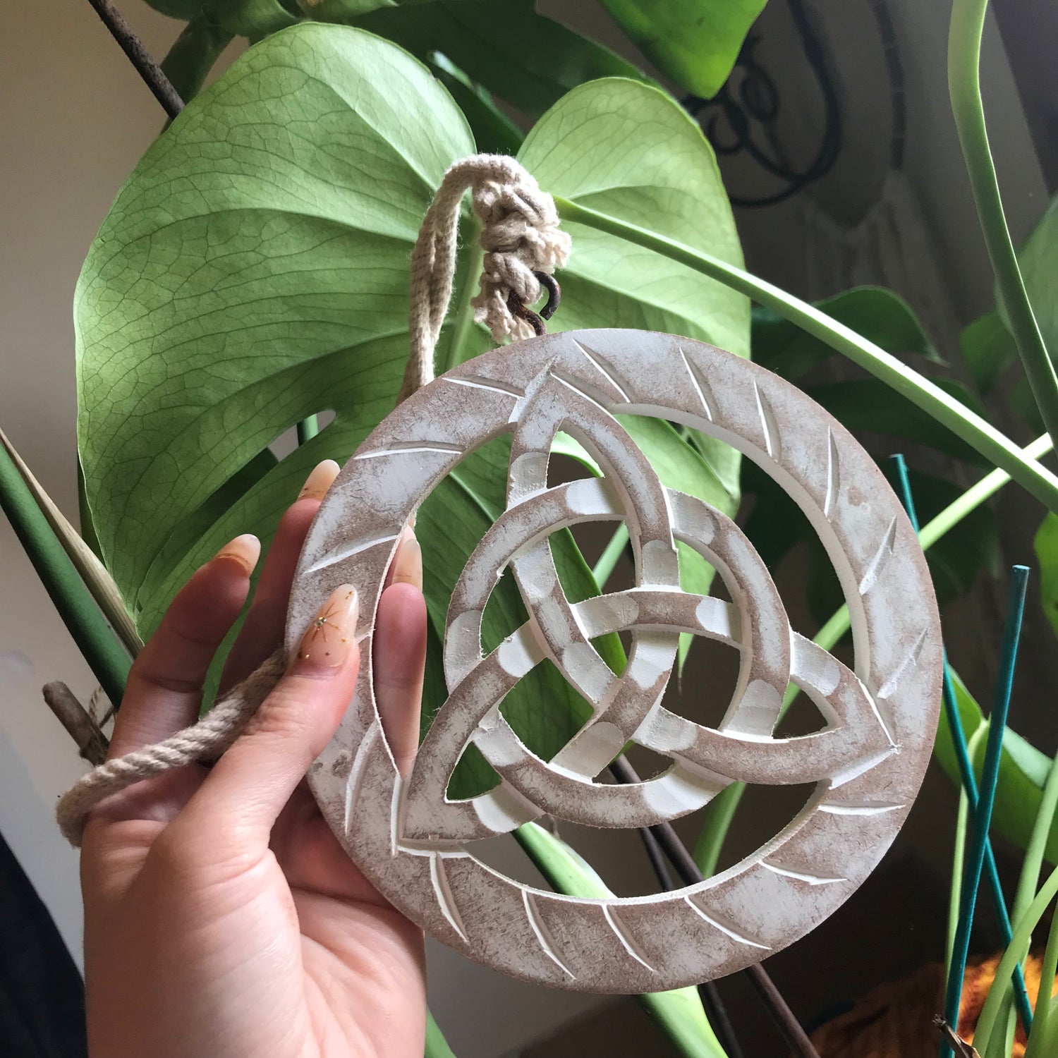 A white-washed wooden wall hanging in the shape of the Triquetra, a celtic symbol used to represent the Maiden, Mother and Crone.